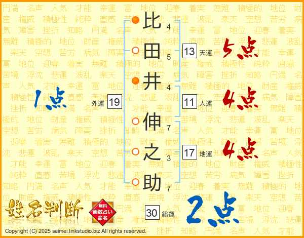 比(4画)田(5画)井(4画) 伸(7画)之(3画)助(7画)