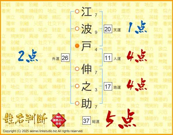 江(7画)波(9画)戸(4画) 伸(7画)之(3画)助(7画)