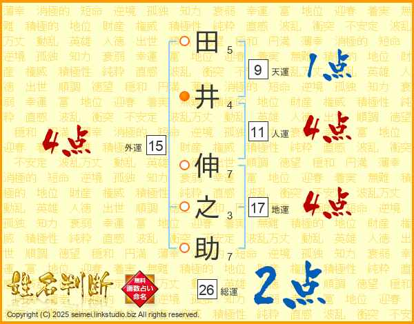 田(5画)井(4画) 伸(7画)之(3画)助(7画)