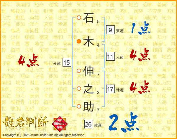 石(5画)木(4画) 伸(7画)之(3画)助(7画)