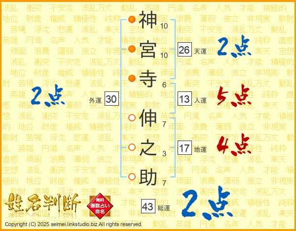 神(10画)宮(10画)寺(6画) 伸(7画)之(3画)助(7画)