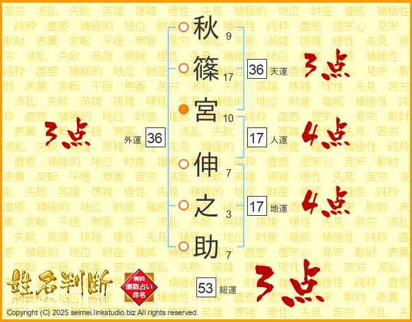秋(9画)篠(17画)宮(10画) 伸(7画)之(3画)助(7画)