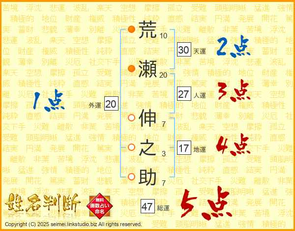 荒(10画)瀬(20画) 伸(7画)之(3画)助(7画)
