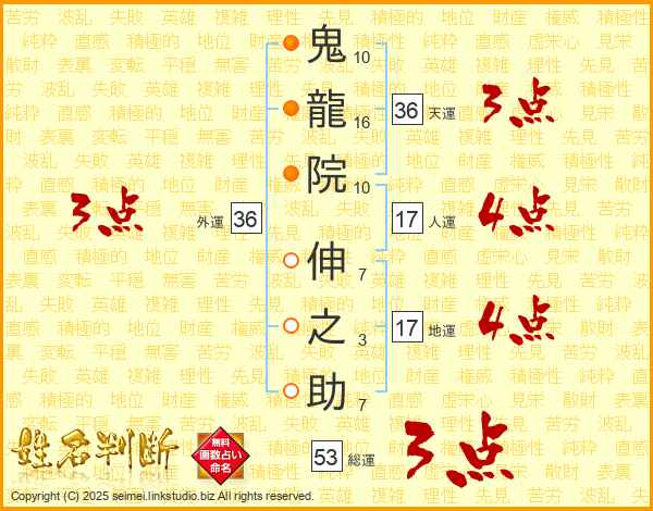 鬼(10画)龍(16画)院(10画) 伸(7画)之(3画)助(7画)