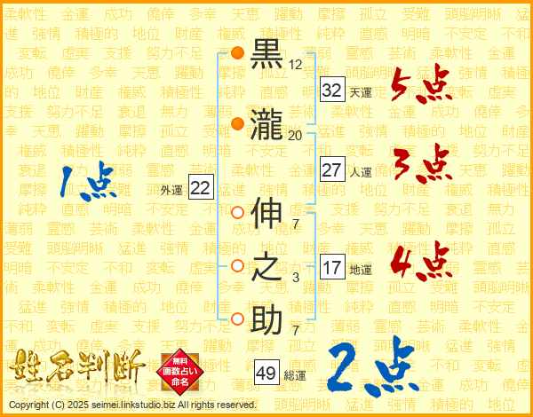 黒(12画)瀧(20画) 伸(7画)之(3画)助(7画)