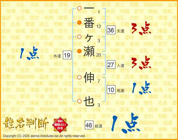 一番ヶ瀬伸也さんの総運は46画の1点!