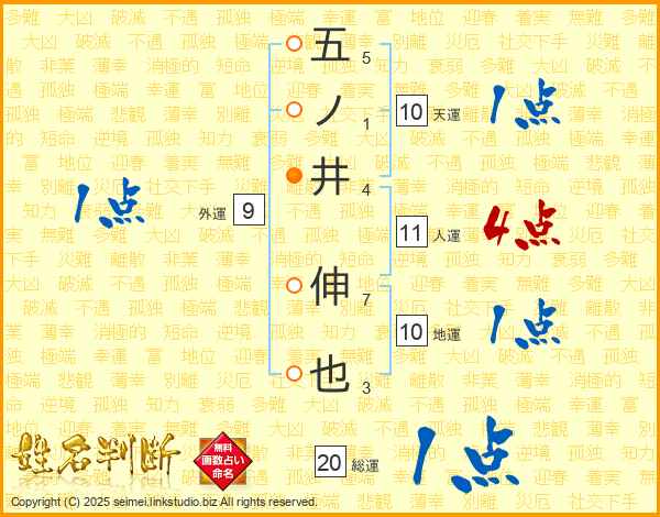五(5画)ノ(1画)井(4画) 伸(7画)也(3画)