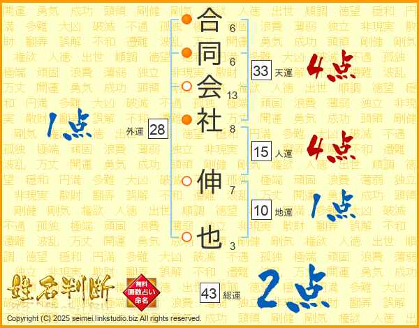 合(6画)同(6画)会(13画)社(8画) 伸(7画)也(3画)
