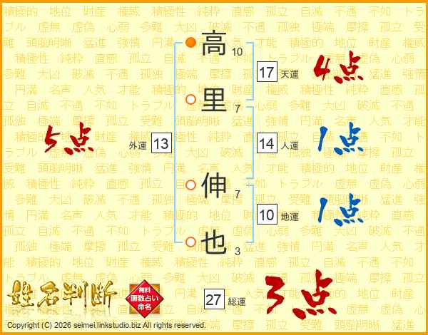 生活面を象徴する運勢です。外部から受ける影響力を表し、結婚運、家庭運や職場、環境への順応性を表します。総運から人運を引いた画数。姓や名が1文字の場合を除く。