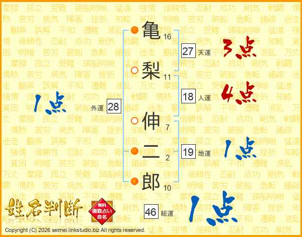 亀(16画)梨(11画) 伸(7画)二(2画)郎(10画)