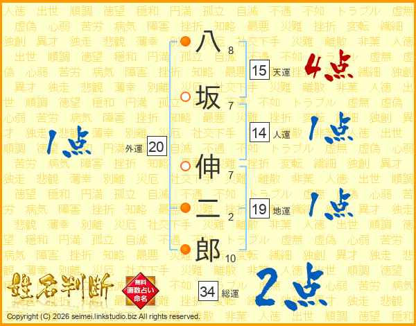 八(8画)坂(7画) 伸(7画)二(2画)郎(10画)