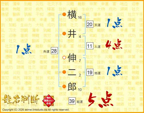 横(16画)井(4画) 伸(7画)二(2画)郎(10画)