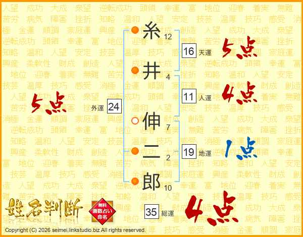 糸(12画)井(4画) 伸(7画)二(2画)郎(10画)