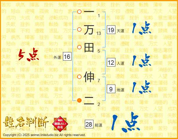 一(1画)万(13画)田(5画) 伸(7画)二(2画)