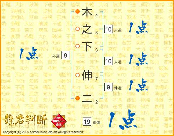 木(4画)之(3画)下(3画) 伸(7画)二(2画)