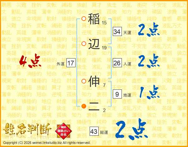 稲(15画)辺(19画) 伸(7画)二(2画)