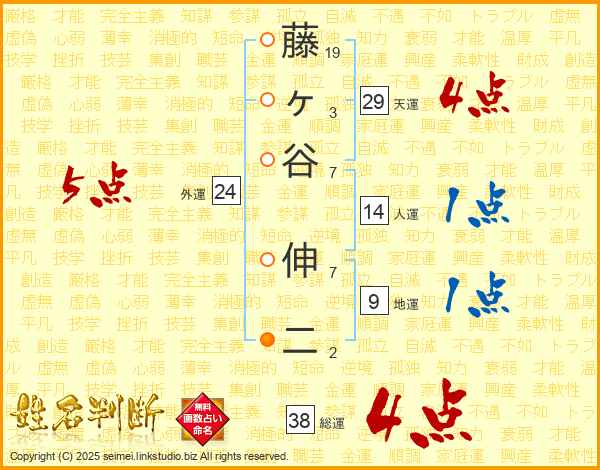 藤(19画)ヶ(3画)谷(7画) 伸(7画)二(2画)