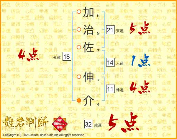 加(5画)治(9画)佐(7画) 伸(7画)介(4画)