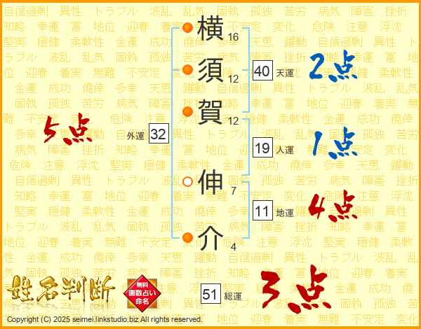 横(16画)須(12画)賀(12画) 伸(7画)介(4画)