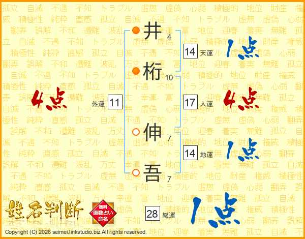 井(4画)桁(10画) 伸(7画)吾(7画)