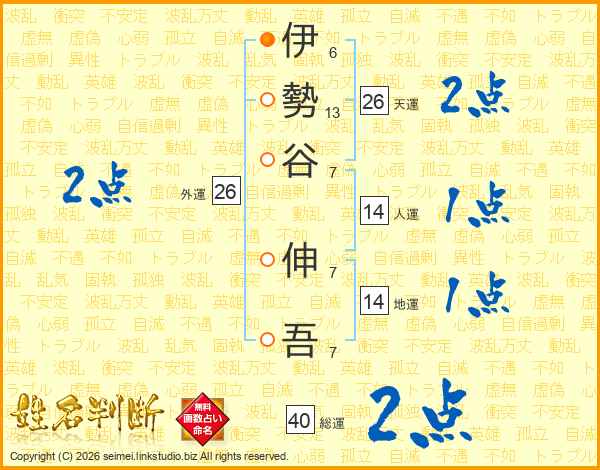 伊(6画)勢(13画)谷(7画) 伸(7画)吾(7画)