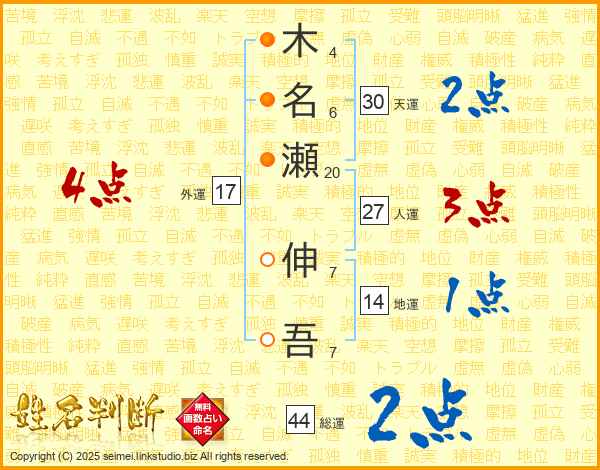 木(4画)名(6画)瀬(20画) 伸(7画)吾(7画)