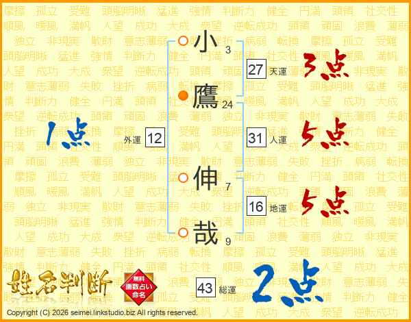 小(3画)鷹(24画) 伸(7画)哉(9画)