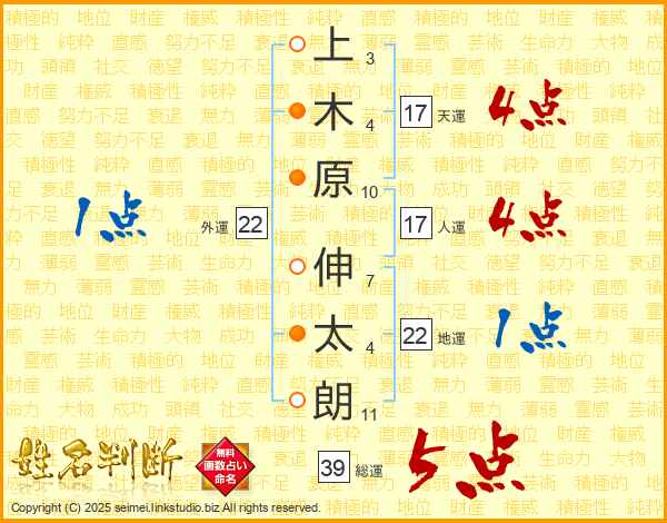 上(3画)木(4画)原(10画) 伸(7画)太(4画)朗(11画)