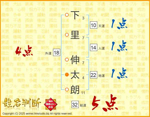 下(3画)里(7画) 伸(7画)太(4画)朗(11画)