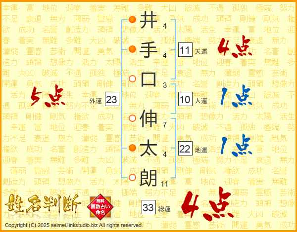 井(4画)手(4画)口(3画) 伸(7画)太(4画)朗(11画)
