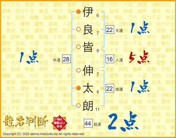 伊(6画)良(7画)皆(9画) 伸(7画)太(4画)朗(11画)