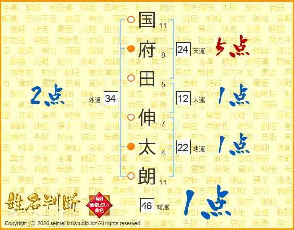 国(11画)府(8画)田(5画) 伸(7画)太(4画)朗(11画)