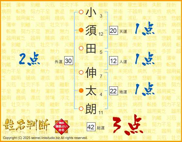 小(3画)須(12画)田(5画) 伸(7画)太(4画)朗(11画)