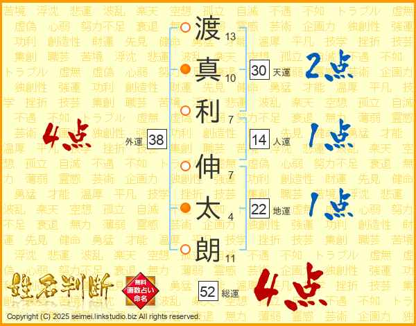渡(13画)真(10画)利(7画) 伸(7画)太(4画)朗(11画)