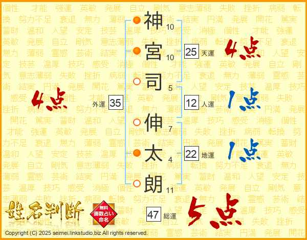 神(10画)宮(10画)司(5画) 伸(7画)太(4画)朗(11画)