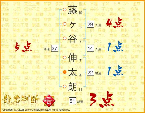 藤(19画)ヶ(3画)谷(7画) 伸(7画)太(4画)朗(11画)