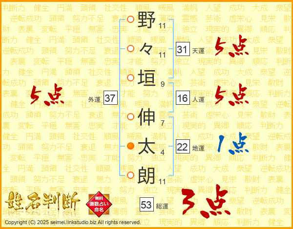 野(11画)々(11画)垣(9画) 伸(7画)太(4画)朗(11画)