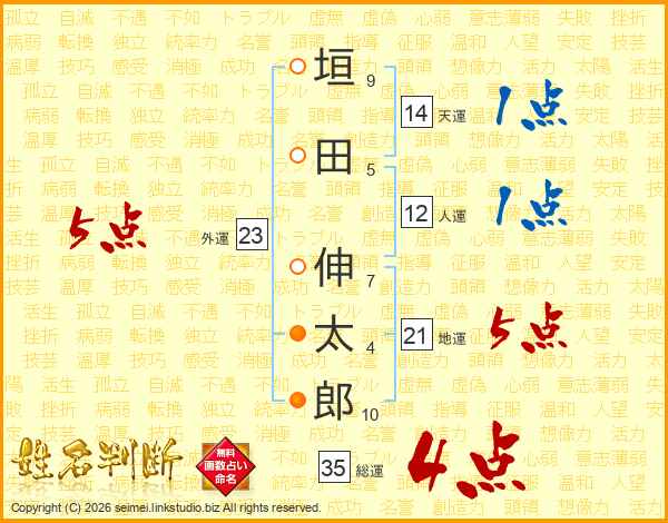 垣(9画)田(5画) 伸(7画)太(4画)郎(10画)