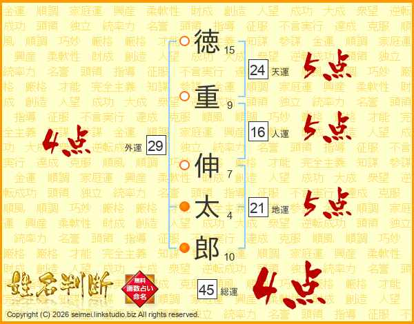 徳(15画)重(9画) 伸(7画)太(4画)郎(10画)