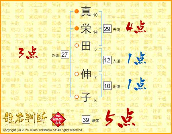 真(10画)栄(14画)田(5画) 伸(7画)子(3画)