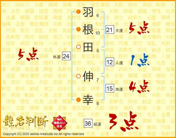 羽(6画)根(10画)田(5画) 伸(7画)幸(8画)