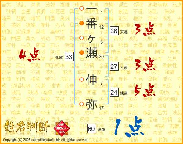 一番ヶ瀬伸弥さんの外運は33画の4点!