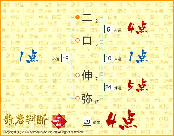 家系が持つ宿命的な運勢を表します。祖先から受け継いだ苗字ですので自分の力が及びません。家柄を象徴します。苗字の合計画数。