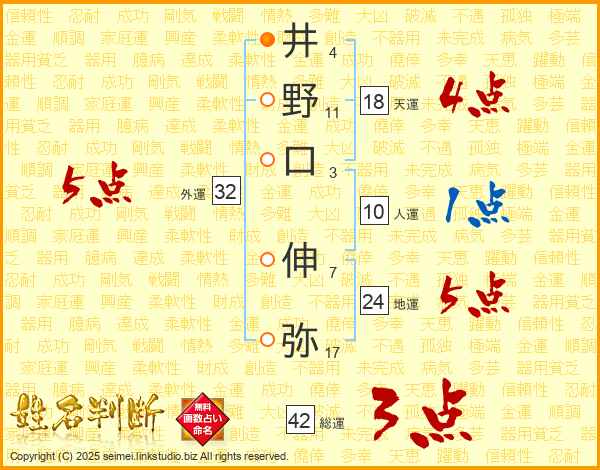 井(4画)野(11画)口(3画) 伸(7画)弥(17画)