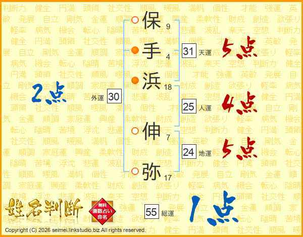保(9画)手(4画)浜(18画) 伸(7画)弥(17画)