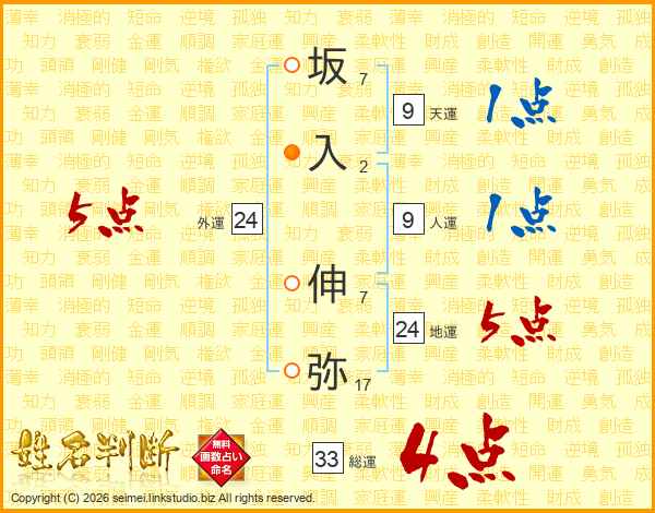 坂(7画)入(2画) 伸(7画)弥(17画)