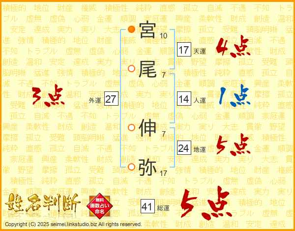 宮尾伸弥さんの総運は41画の5点!