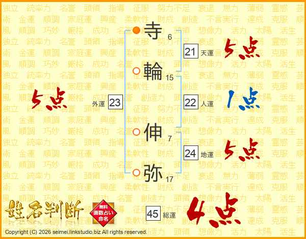 寺(6画)輪(15画) 伸(7画)弥(17画)