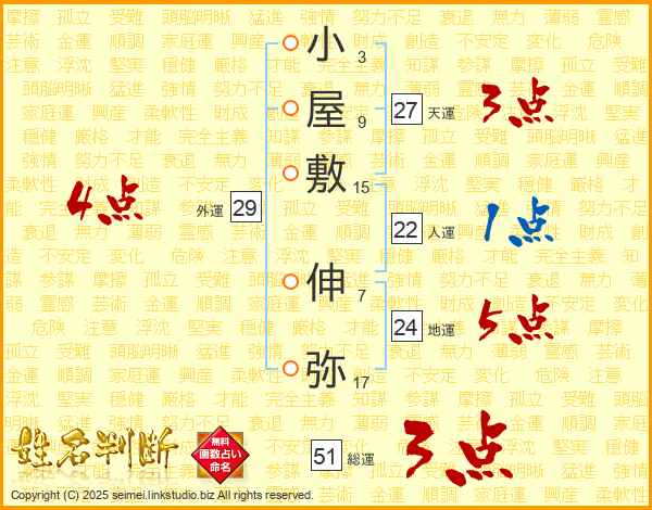 小(3画)屋(9画)敷(15画) 伸(7画)弥(17画)