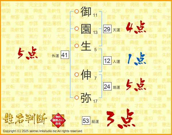 御(11画)園(13画)生(5画) 伸(7画)弥(17画)